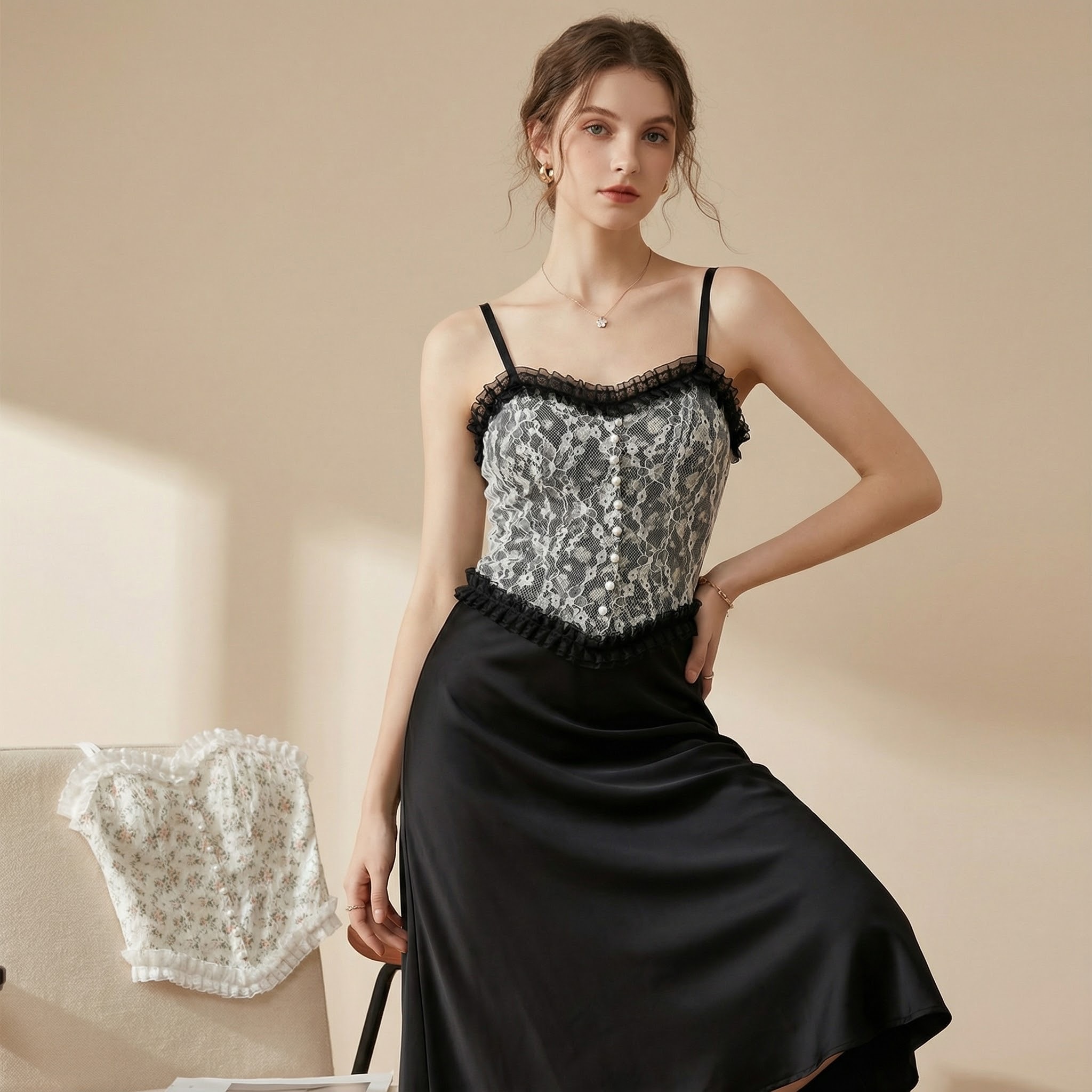 کراپ تاپ مجلسی کاپدار با بند رگلاژی و دکمه‌های مرواریدی